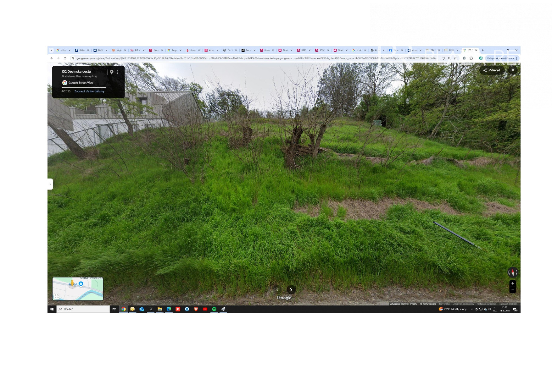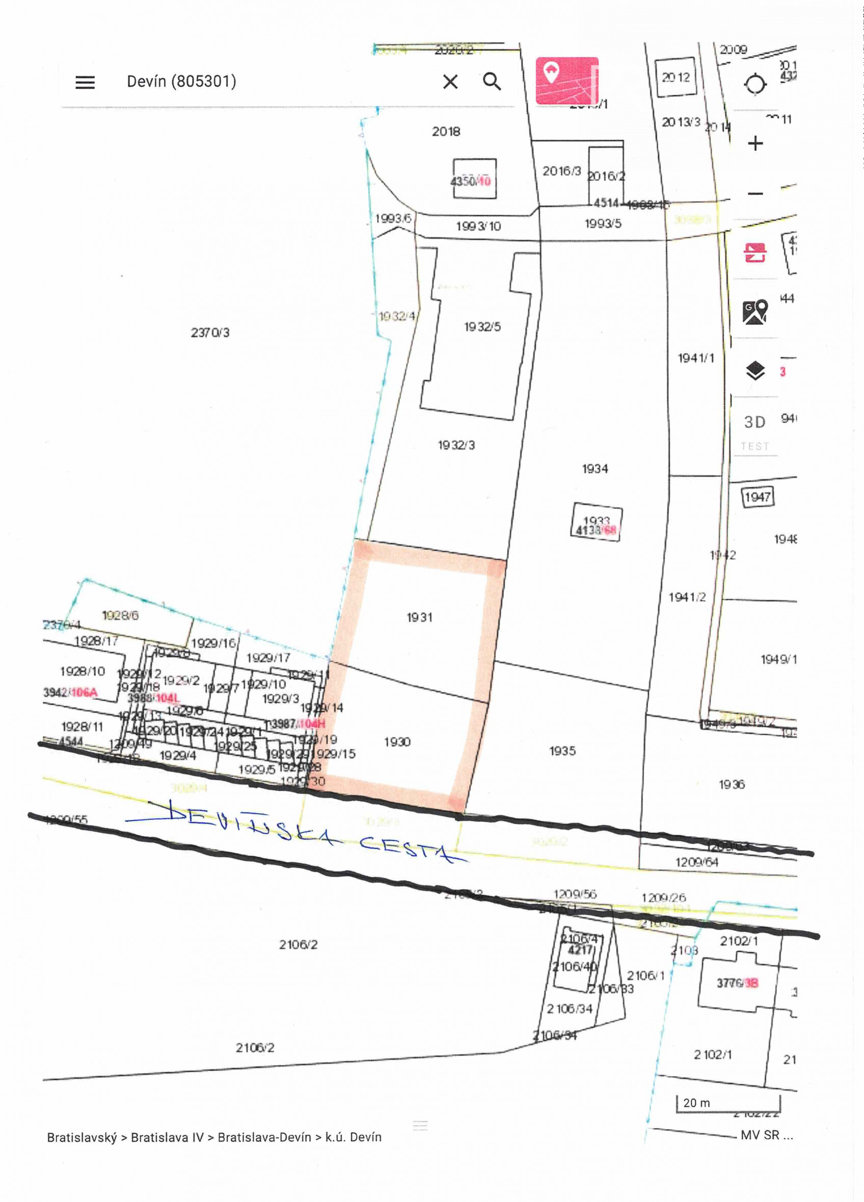 POPIS: Pozemok o veľkorysých 15 árov, s južnou orientáciou v svahu na hranicy lesa, ideálny na výstavbu villy, príp RD s dvoma-troma bytovými jednotkami, s výhľadom na Rakúsko, rsp. na Sihoť, lesný porast..Presná výmera poamku je 1478m2, katastrálne územie Devín, vzdialenosť od cenra par minut autom, rsp. MHD. S inžinierskych sietí je na pozemku, elektrika a voda. Splašky je nutné riešiť malou ČOVkou, pripadne žumpou. UPI k dispozícii.