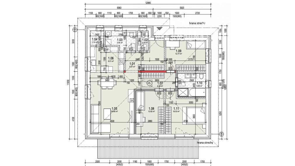 Do domu sa vchádza cez priestrannú vstupnú halu. Rodinný dom je dobre dispozične členený na dennú a nočnú časť. Zo vstupnej miestnosti sa chodbou dostanete do dennej časti, kde nájdete spojenú kuchyňu s malou komorou s jedálenskou časťou a obývačkou a terasou.. Na chodbe je situované samostatná toaleta a technická miestnosť s práčovňou. Ďalej sa chodbou dostanete do nočnej časti, kde nájdete 3 samostatné nepriechodné izby: detská izba, pracovňa alebo druhá detská izba a spálňa s východom na terasu cez balkónové dvere. V tejto časti domu sa nachádza aj kúpelňa, kde je možné umiestniť sprchovací kút, vaňu a dve umývadlá.