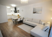 DISPOZÍCIA: Vynikajúce funkčné dispozičné riešenie je rozdelené na dennú a nočnú časť. Otvorený obývací priestor s jedálenským stolom a kuchynským kútom je centrom socializácie rodiny. Kľudový režim zabezpečujú dve izby s loggiou a manželská spálňa so samostatnou kúpeľňou čo ešte zvyšuje komfort. Druká kúpeľňa a „hosťovské“ WC sú samostané, prístupné hneď zo vstupnej komunikácie.