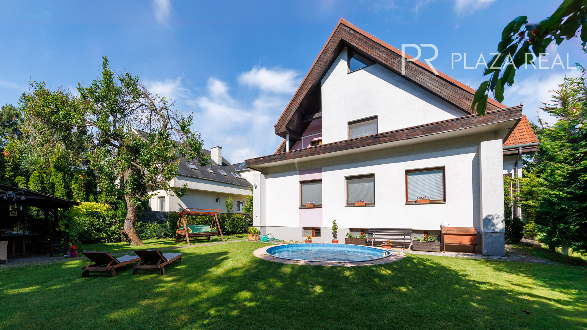 slnečný, priestranný rovinatý pozemok s krásnou záhradou, s altánkom a bazénom