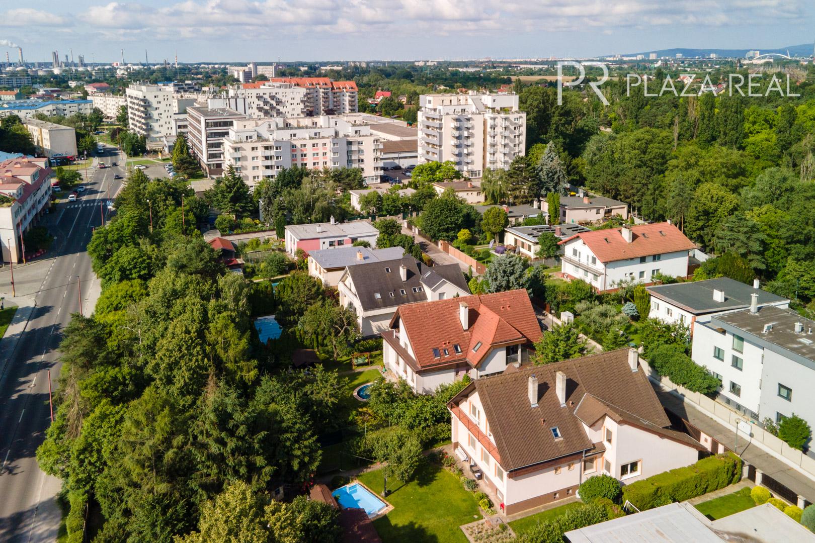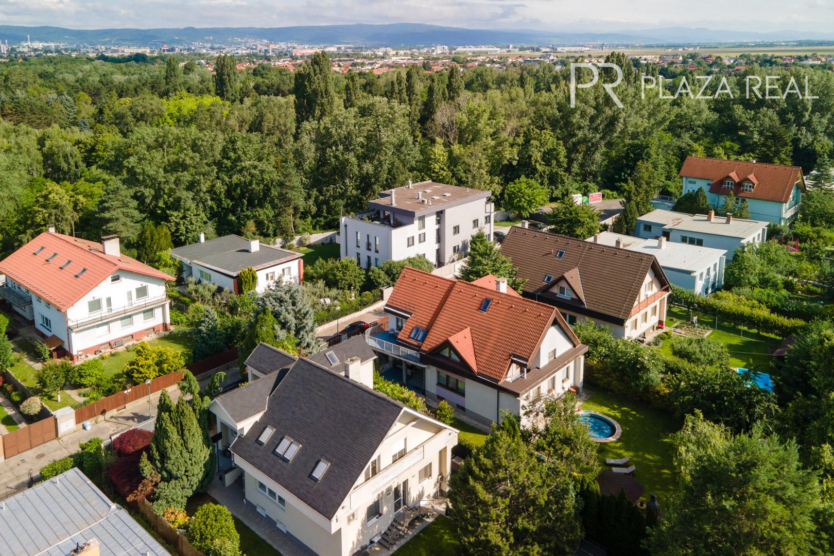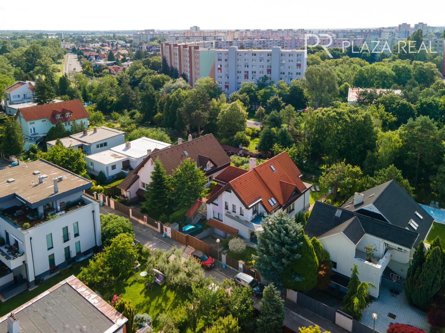 Rodinný dom s dvoma samostatnými bytovými jednotkami a veľkým pozemkom sa nachádza v tichej časti Vrakune v tesnej blízkosti lesoparku a s dobrou dostupnosťou na bratislavský obchvat. Dom je ideálny na rodinné bývanie pre dve rodiny ale aj pre podnikateľské účely. Je podpivničený, trojpodlažný. Je situovaný v príjemnej tichej ulici s veľmi dobrými susedskými vzťahmi. Súčasťou domu s priestranným pozemkom a záhradou ( 802m2) + oplotený pozemok v dlhodobom užívaní (366m2) je aj veľká dvojgaráž s montážnou jamou, murovaný bazén, studňa na pozemku, vonkajší altánok s murovaným krbom. Pôvodný dom ( suterén, prízemie) bol skolaudovaný v roku 1972 a neskôr v r.2002 bol nadstavovaný o ďalšie poschodie s povalou so samostatným vstupom. Zároveň dom prešiel celkovou rekonštrukciou ( nová strecha, zateplenie celého domu, vstupné vchodové priestory, garáž, nové drevené okná, rekonštrukcie izieb, kuchyne, kúpeľne, WC na prízemí).